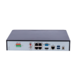 Grabador de vídeo en red Uniview UV-NVR501-04B-P4-A con 4 canales IP y switch PoE integrado de 4 puertos. Soporta resolución 4K, compresión H.265 para optimizar almacenamiento y permite conectar cámaras IP sin necesidad de switches externos. Ideal para instalaciones de seguridad perimetral, comercios y pequeñas empresas que requieren videovigilancia profesional con gestión centralizada.